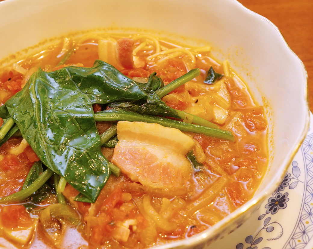 1,290円 (税込)程よく酸味の効いたトマトスープの中に⼊っている太麺の⽣パスタはもちもちの⾷感でスープによく絡みます。