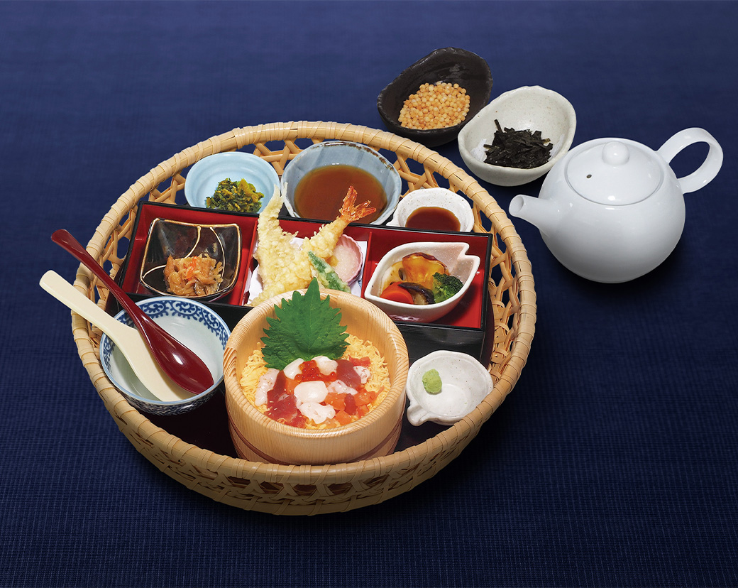 1,749円 (税込)「彩り花籠」は当店自慢の特製だしで3度愉しめる彩りおひつとこだわり天ぷらや小鉢を花籠に仕立でご提供いたします。