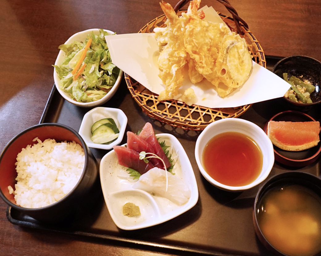 2,480円(税込)海鮮と野菜の天ぷらに、お刺⾝・サラダ・フルーツまでついたセット。揚げたての天ぷらと、毎⽇だしからとる天つゆの相性は抜群。