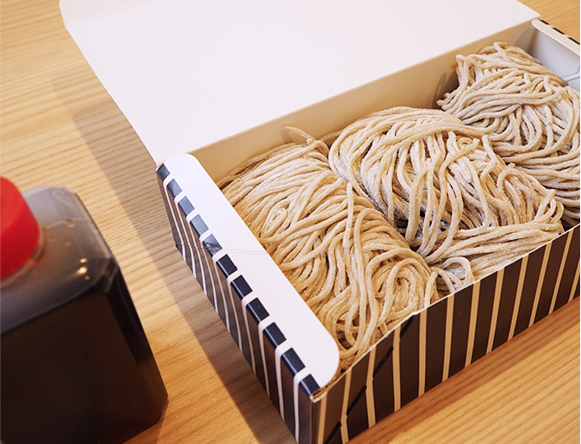 ⽣そばは購⼊の際、茹で時間や氷⽔で締めるなどの家でもお店の味が楽しめるコツも伝授。つゆもついているので茹でたらすぐに⾷べられるのもポイントです。※写真は3⼈前です。