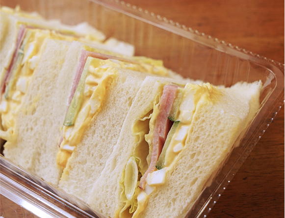 ふわふわのパンでつくられたサンドイッチは添加物を使⽤せず、店内で1つ1つ⼿作りしています。
