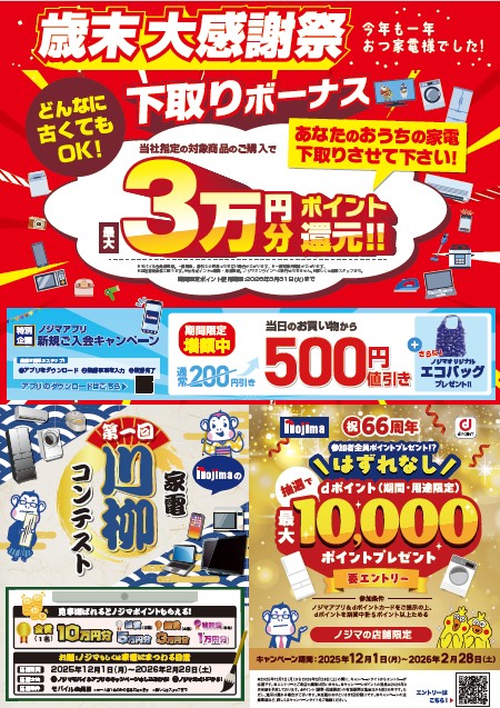 いつもノジマ田無アスタ店をご利用いただき、誠にありがとうございます。 12/15(月)・20(土)・25(木)・28(日)・31(水)はポイントアップDAY! 通常はノジマはアスタポイントアップ対象外店舗ですが、ノジマ歳末大感謝祭も開催中ですので、特別にポイントアップします! 12/15(月)・25(木)・28(日)・31(水)は通常の【3倍】で、12/20(土)はなんと通常の【5倍】でやらせていただきます! おトクにお買い物できるこの機会にぜひお見逃しなく! スタッフ一同、皆さまのご来店を心よりお持ちしております。