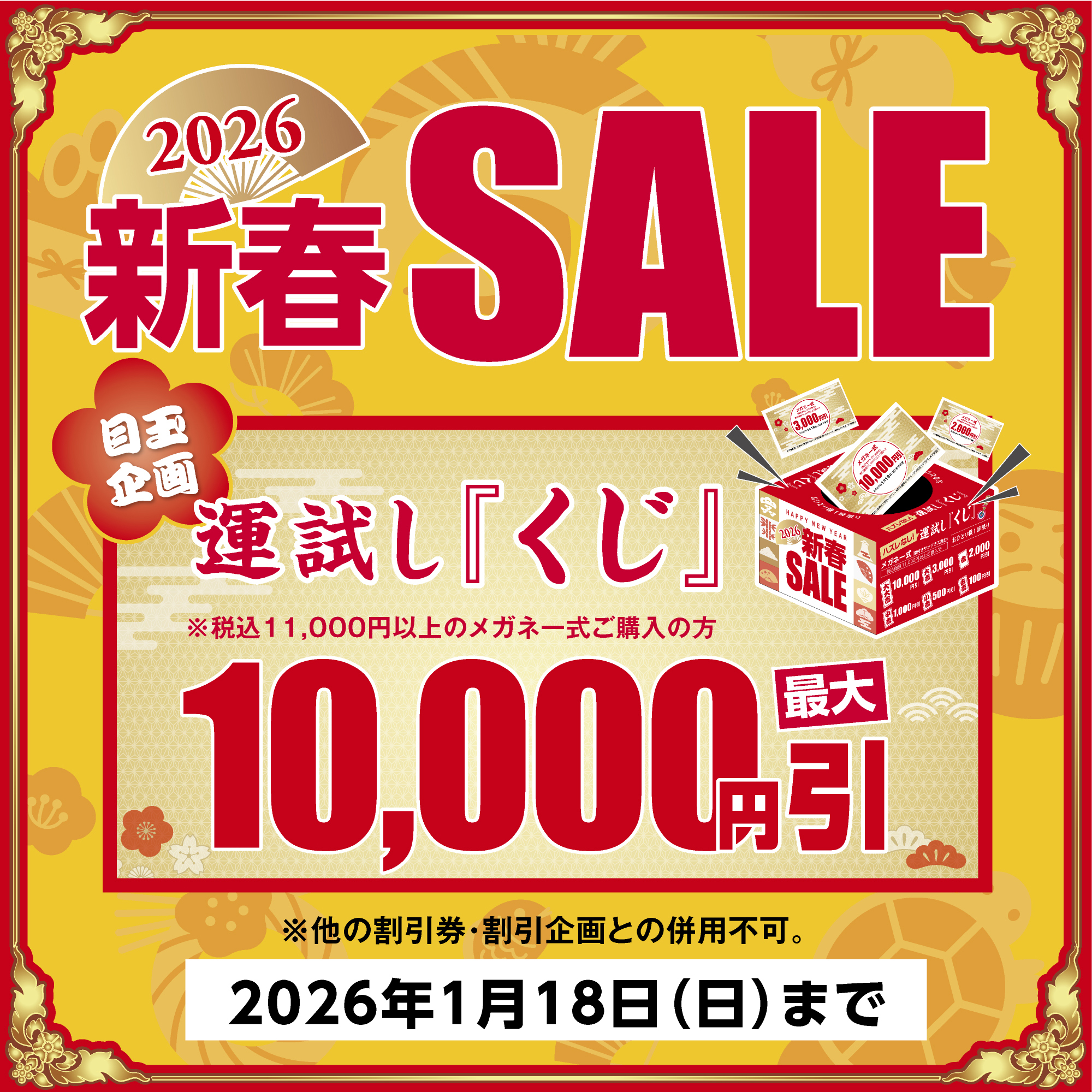 "愛眼の新春SALEが2026年1月18日(日)まで開催です! ■企画1 メガネ・サングラスが最大50%OFF! ■企画2 期間中、税込11,000円以上のメガネ一式(度付きサングラス含む)をご購入いただいた方は、最大1万円引きが当たる【運試しくじ】にチャレンジいただけます! 新しいメガネで、清々しい1年をスタートしませんか? スタッフ一同、皆さまのご来店を心よりお待ちしております!" https://www.aigan.co.jp/feature/shinsyun_sale_2026/